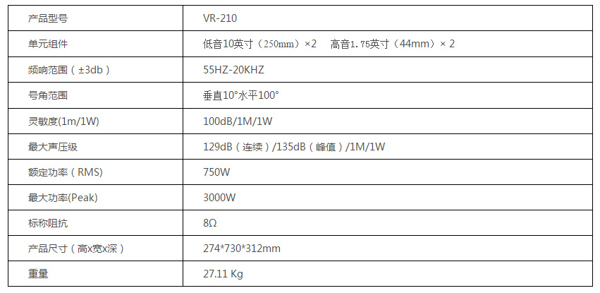 VR-210全頻箱配置的是2個10寸紙盆釹磁低音揚聲器和2個1寸高音驅(qū)動器。裝于10寸箱體前部的壓縮腔相位塞(compression chamber phase plug) 防止低頻段由于梳狀濾波產(chǎn)生干涉, 化了低頻指向性。結(jié)合在兩個高音驅(qū)動器和1個超高音驅(qū)動器間經(jīng)過耦合的優(yōu)化波形生成器,形成一個10°的垂直波面,生成非常厚實的低頻和明亮的高音。