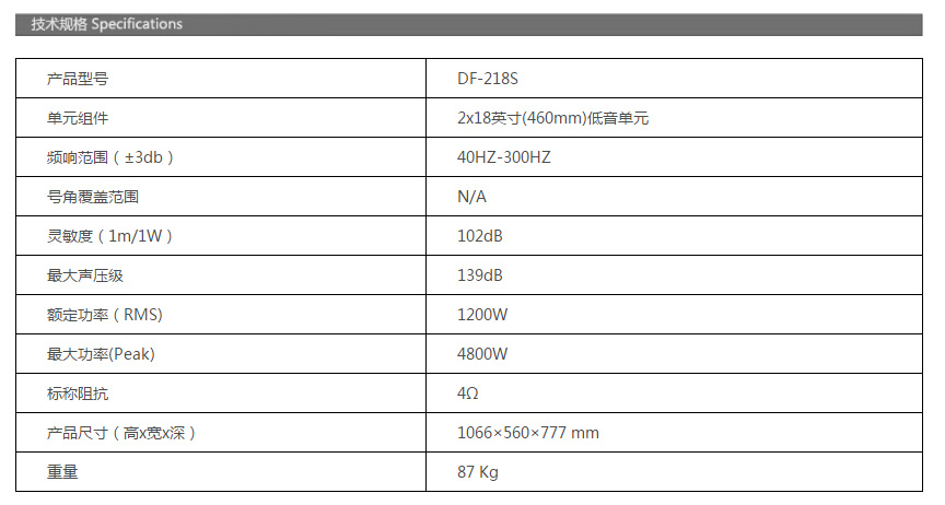 特色:雙驅(qū)動(dòng)直接輻射式超低音;高強(qiáng)度進(jìn)口樺木板材配合無縫隙結(jié)合結(jié)構(gòu),聲音更自然有力,下沉穩(wěn)重;使用2只進(jìn)口18寸低頻單元;寬覆蓋范圍結(jié)構(gòu)設(shè)計(jì);強(qiáng)勁的低頻爆發(fā)力,下潛深而有力,飽滿而富有彈性;通透干凈的超低頻包圍和現(xiàn)場(chǎng)效果;采用高強(qiáng)度的特殊油漆,防滑耐磨;特殊的酒吧聲線設(shè)計(jì)與全頻搭配。