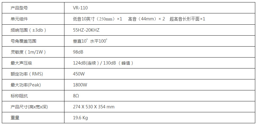 VR110全頻箱配置的是1個10寸紙盆釹磁低音揚聲器和2個1寸高音驅動器。裝于10寸箱體前部的壓縮腔相位塞(compression chamber phase plug) 防止低頻段由于梳狀濾波產(chǎn)生干涉, 化了低頻指向性。結合在兩個高音驅動器和1個超高音驅動器間經(jīng)過耦合的優(yōu)化波形生成器,形成一個10°的垂直波面,生成非常厚實的低頻和明亮的高音。