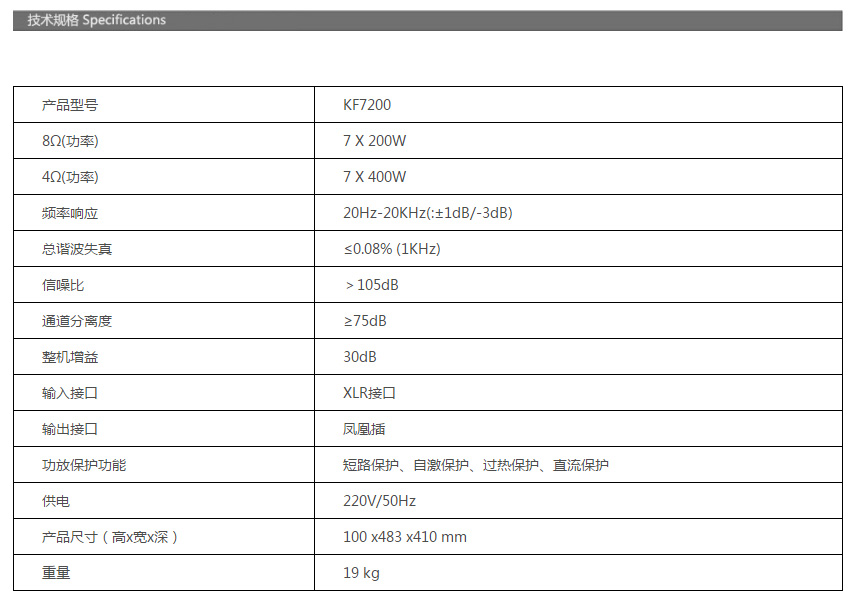 KF7200是一款7通道功率放大器。它采用全平衡、低失真、低噪聲、高速HI-FI型功放線路,音色通透,轉換速率快,可以達到高保真音質要求。