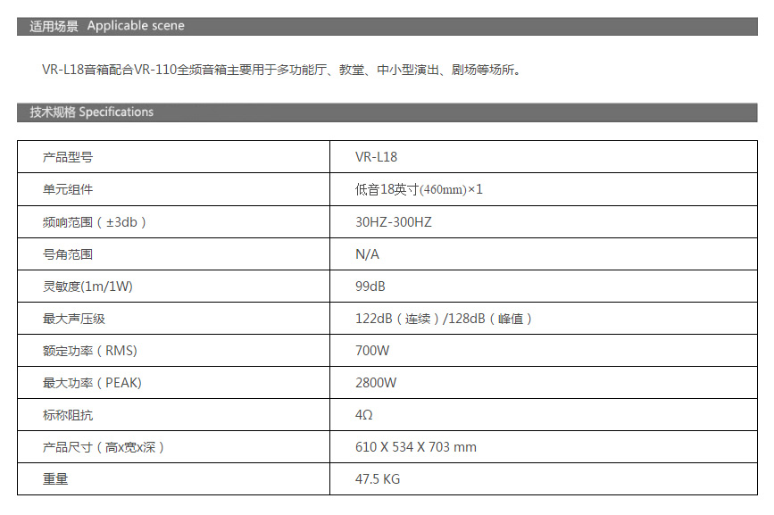VR-L18低音音箱給VR-110線陣列系統(tǒng)帶來了新的功能,以較低的成本提供高的SPL。這款單15英寸的長橫程低音揚聲器可以與VR-110線陣列模塊一起吊裝使用,或者與VR-110箱體一起進行地板堆疊安裝。