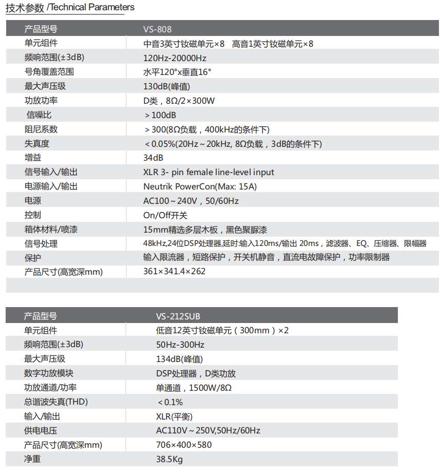 VS-808采用8個(gè)3″*率釹磁中音揚(yáng)聲器和8個(gè)1″直接輻射釹磁高音揚(yáng)聲器;