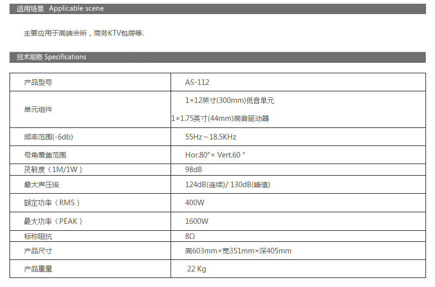 AS-112 是專為KTV應用而設計的全頻揚聲器,它配備了大功率、*能的低音單元,和1.75寸的鈦振膜高音壓縮驅動器。特別設計的對稱單后置通風對流孔散熱設計,結合高靈敏度的大功率低音單元,保證在大功率情況下、長時間能夠穩(wěn)定使用,AS系列具有后置出氣孔設計的增強低頻效果,同時具有前置出氣孔箱體設計的中頻靠前的風格特性,克服了傳統(tǒng)后置出氣孔揚聲器中頻靠后和凹陷的問題,讓系統(tǒng)更容易輕松“入咪”。*1.75寸鈦振膜高音壓縮驅動器加上針對室內近距離演唱設計的高頻號角,減小了對高頻信號的壓縮失真,使高頻細膩柔順,無論水平或垂直擺放,身處房間任何位置,都可以欣賞到一致均衡的聲音效果。