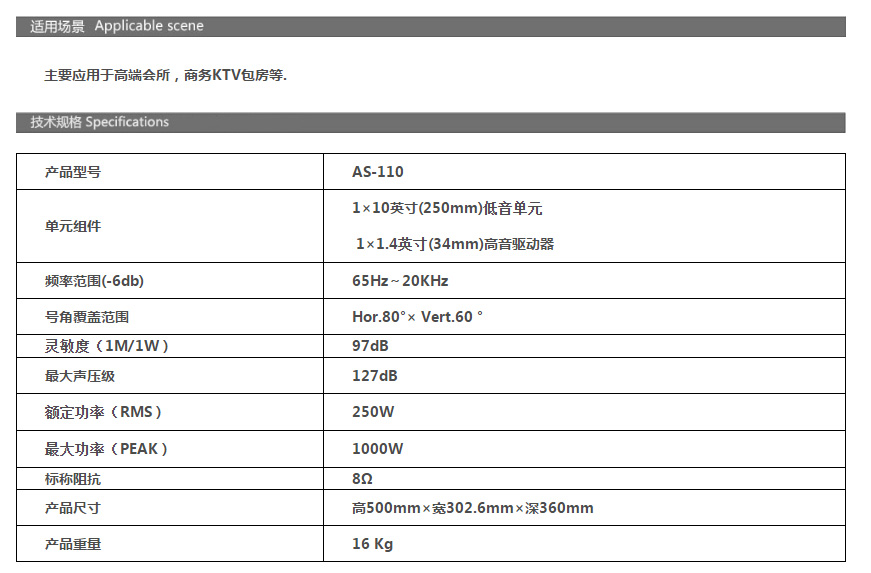 AS-110 是專為KTV應用而設計的全頻揚聲器,特別設計的對稱單后置通風對流孔散熱設計,結合高靈敏度的大功率低音單元,保證在大功率情況下、長時間能夠穩(wěn)定使用,AS系列具有后置出氣孔設計的增強低頻效果,同時具有前置出氣孔箱體設計的中頻靠前的風格特性,克服了傳統(tǒng)后置出氣孔揚聲器中頻靠后和凹陷的問題,讓系統(tǒng)更容易輕松“入咪”。高頻細膩柔順,無論水平或垂直擺放,身處房間任何位置,都可以欣賞到一致均衡的聲音效果。